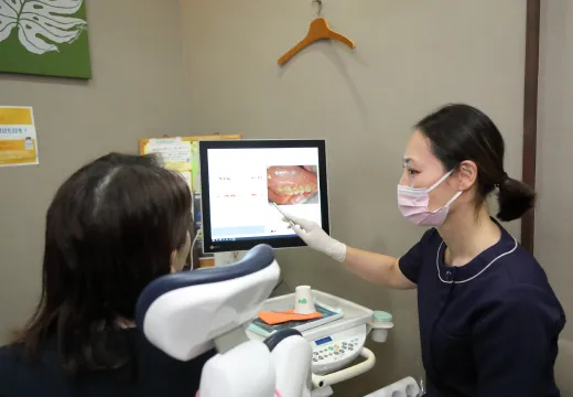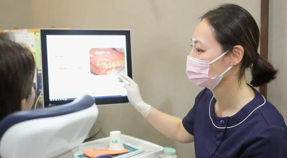 治療用チェアーにおかけになったまま、お口の中の状態をモニターにてご確認いただけます。このモニターを見ていただきながら、むし歯や口腔内の症状などをご説明致します。