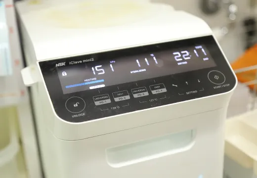 ハンドピースの滅菌器です。しっかりと滅菌できる直熱ヒートシステムで、温度ムラが少なく、効率的な高圧蒸気滅菌を行っています。
