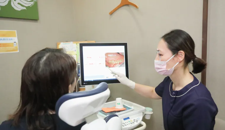 歯周病のケアでは、まず正しいブラッシングがなによりも大切です。当院ではご自宅でお使いの歯ブラシについて、当て方・サイズ・硬さ・交換時期の説明をさせていただきます。より効率よくブラッシングすることで歯周病・むし歯のプラークを除去できる方法を指導させていただいております。また、歯磨きは手で磨くのが基本です。電動歯ブラシを使用すると磨いた気になってしまい、意外に歯垢が残っているケースがあります。歯科医は、毎日患者様のお口の中をチェックするわけにはいきません。そういう意味では、歯周病ケアは患者様ご本人の自覚と努力がないと始まりません。「歯周病にならない」「これ以上悪くしない」という強い意思で、毎日のケアを欠かさないことです。歯科医は、あくまでそのサポート役を務めるだけなのです。